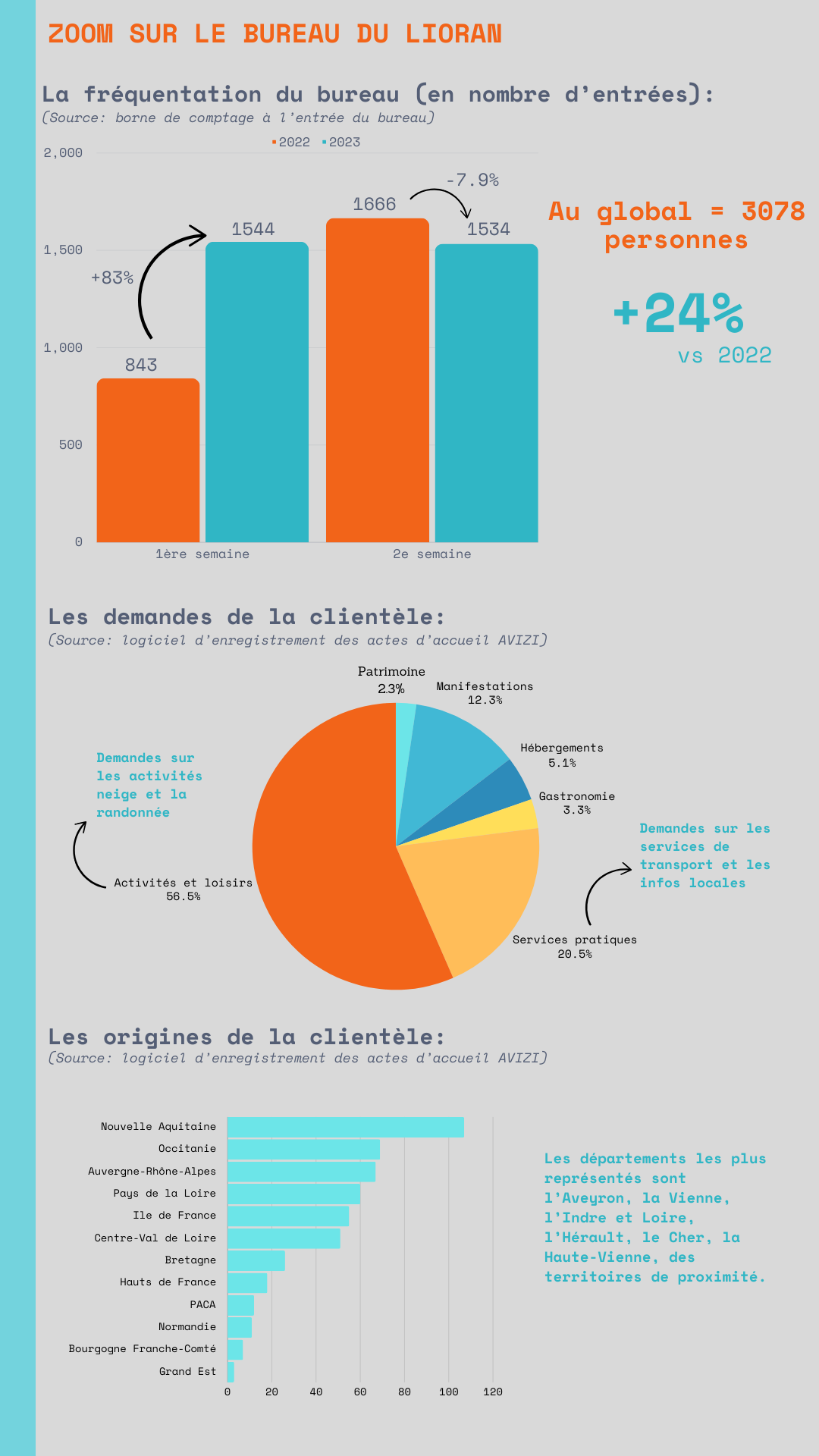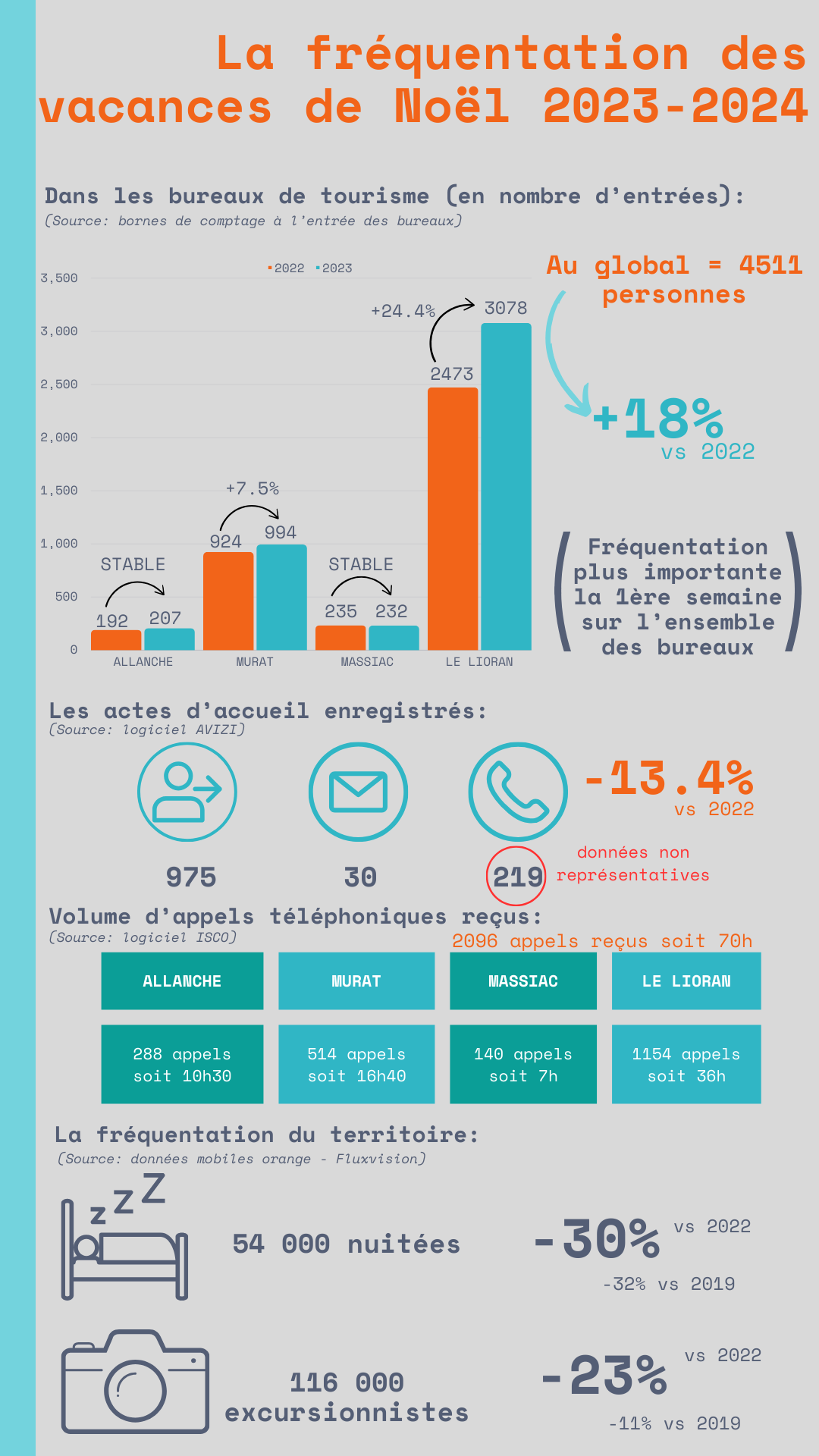 Dans les bureaux de tourisme de Hautes Terres, la fréquentation aux bornes de comptage est en hausse de 18% par rapport à 2022 avec une fréquentation plus importante la première semaine sur l’ensemble des bureaux. La demande est très forte au niveau des actes d’accueil téléphonique avec 70h d’appels reçus sur les vacances. Sur le bureau du Lioran, le plus fréquenté à cette période, les chiffres sont à la hausse, de bons présages pour les vacances d’hiver.