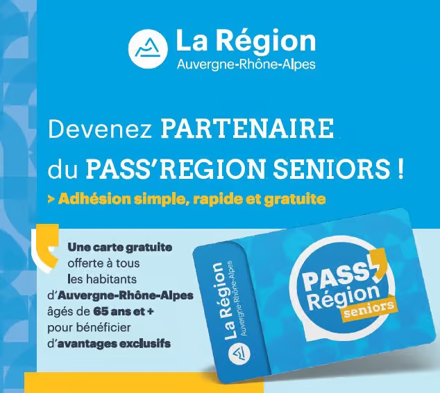 • Le Pass’Région Seniors est un dispositif mis en œuvre par la Région Auvergne-Rhône-Alpes. Il est destiné à toutes les personnes de 65 ans et plus, résidant sur le territoire régional sans condition de ressources.